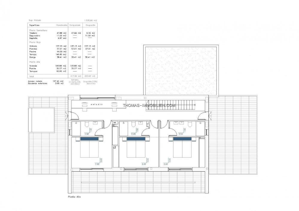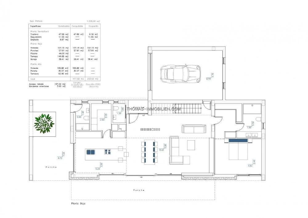 Das Haus ist von exquisitem Design, ebenso wie seine Innenausstattung. Es verfügt über eine Garage, 4 Schlafzimmer, fünf Badezimmer (eines außen) und eine Gästetoilette, einen großen Abstellraum im Keller. Die überdachte bebaute Fläche beträgt 430 m2 plus 200 m2 Terrassen.