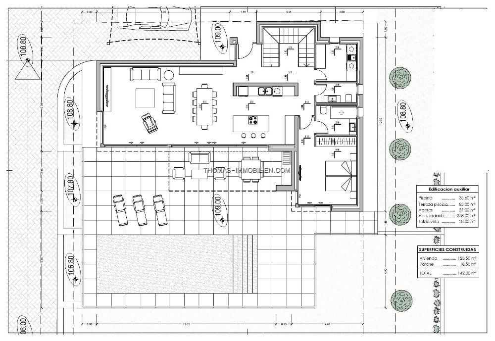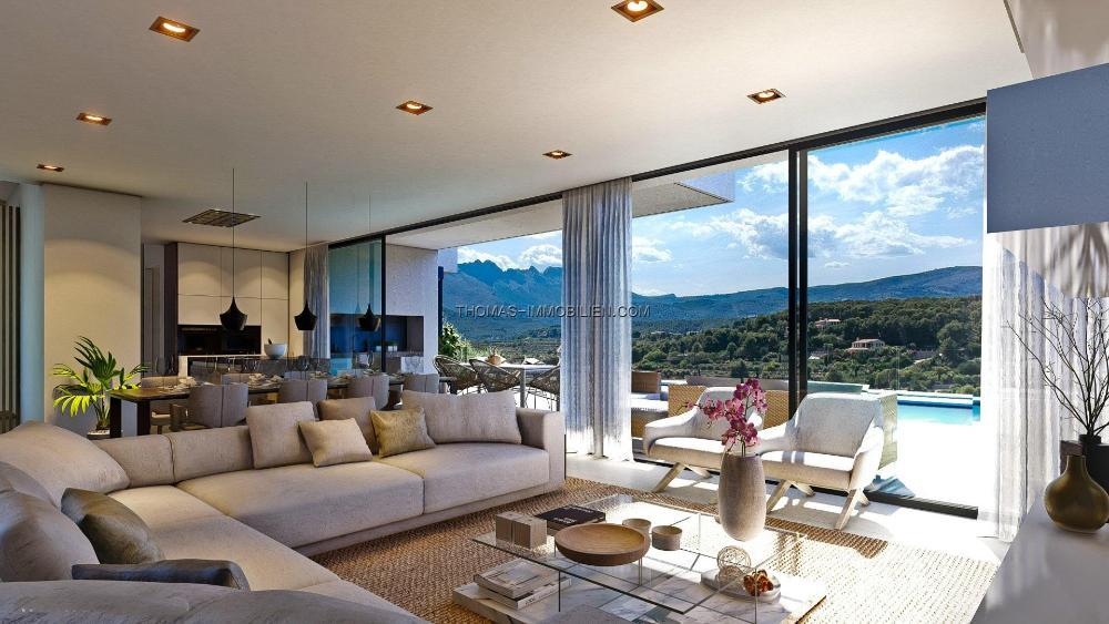 Auf dieser Etage befindet sich auch ein Hauptschlafzimmer mit Bad. Und die große Terrasse mit Pool auf gleicher Ebene.
