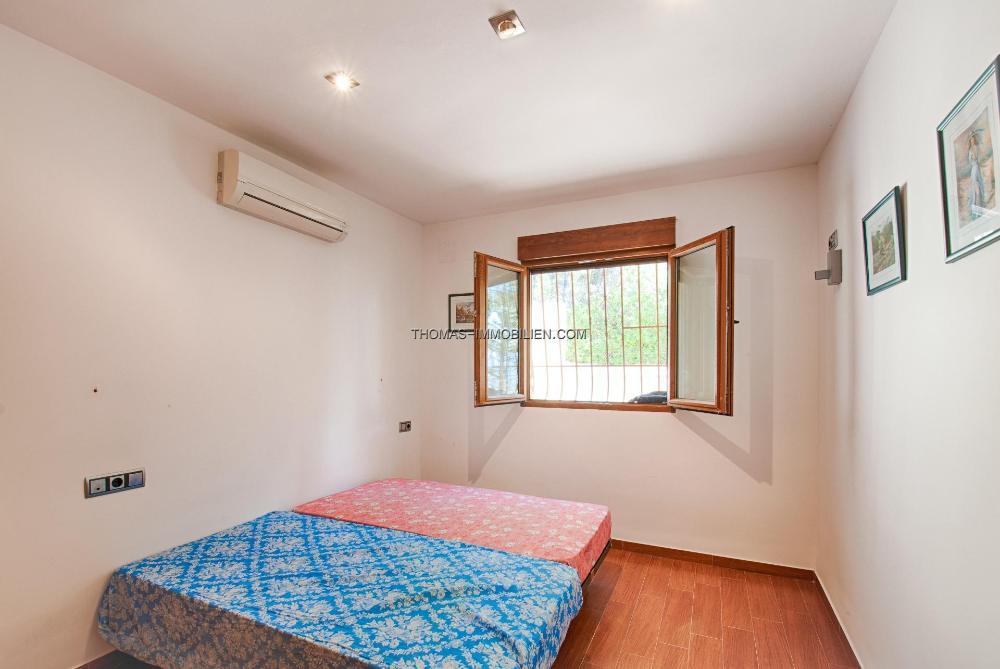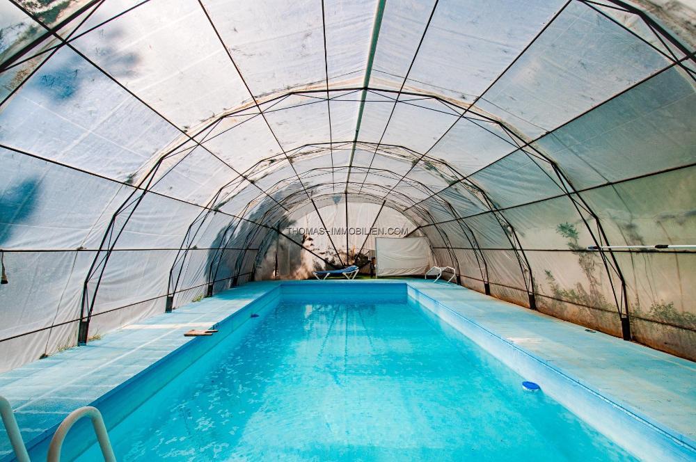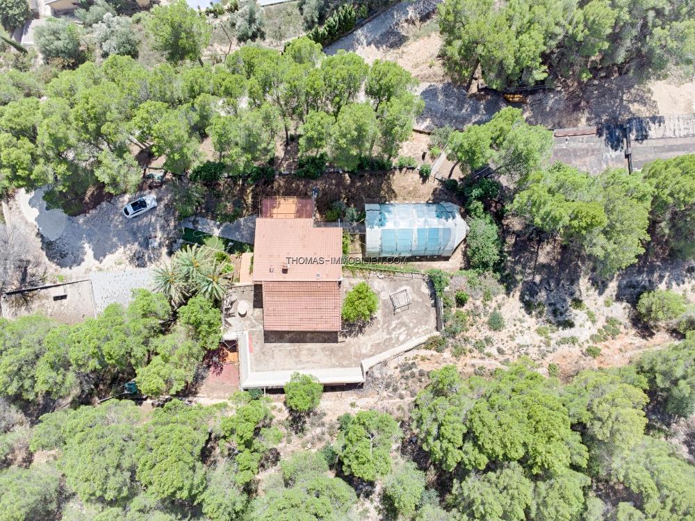 Neben dem Wohnzimmer befindet sich die voll ausgestattete und möblierte Küche, die über eine Speisekammer mit Regalen verfügt, in der ausreichend Stauraum vorhanden ist. Der gleiche Raum kann zum Essen und Kochen mit der Familie genutzt werden, da er recht geräumig ist. Im Flur haben wir auch eine Toilette für Gäste und Familienangehörige. Der restliche Teil des Hauses ist in vier geräumige und helle Doppelzimmer mit Doppelfenstern und einem kompletten Badezimmer mit gemeinsamer Duschkabine aufgeteilt. An der Außenseite des Hauses befinden sich eine Terrasse mit einem Erholungsbereich, einschließlich einer Bank und einem Tisch, sowie ein Raum (heute als Waschküche genutzt). Alles rund um das Haus ist zementiert und bietet auf Wunsch Unterstützung für zukünftige Installationen von Solarmodulen. Wenn wir in den Gartenbereich hinuntergehen, haben wir die überdachte Veranda und die Garage (die heute als Abstellraum und Keller genutzt wird) und von hier aus haben wir durch ein Kinderschutztor Zugang zum überdachten Pool, der sowohl im Sommer als auch im Winter genutzt werden kann. Der gesamte Pinienwald und das über 2,6 Hektar große Feld rund um das Haus sollen gereinigt und gepflegt werden, mit der Möglichkeit der Gartenanlage und der Einzäunung des gesamten Grundstücks.