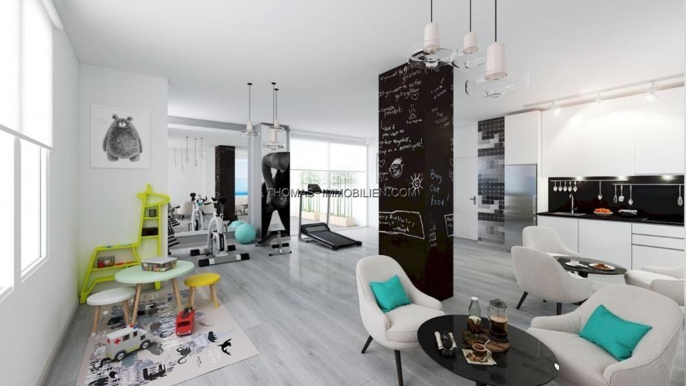 Der Gemeinschaftsbereich mit Gärten, Swimmingpool, Paddle-Tennisplatz und überdachtem Erholungsbereich lädt nach einem Tag am Strand zum Verweilen ein. Um den Sonnenuntergang zu bewundern, gibt es auf der 9. Etage einen Gemeinschaftsraum mit Meerblick, einen Fitnessraum, eine Terrasse und einen Gourmetbereich.