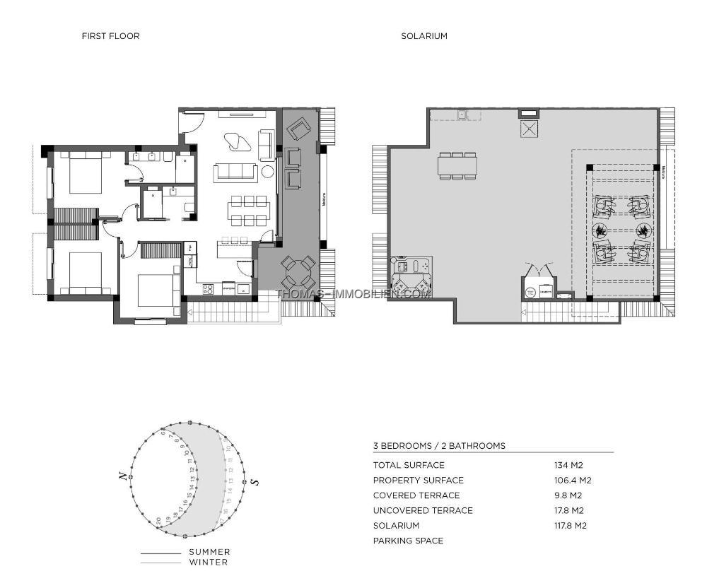 Moderne Doppelhaushälften über 2 Etagen gebaut und verfügt über 3 Schlafzimmer, 2 und 3 Bäder, offene Küche und den Wohnbereich, Einbauschränke, Terrassen, privaten Garten und Solarium.