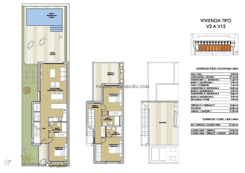 Die Immobilien verfügen über geräumige Zimmer, die sich auf 2 Etagen verteilen. Im Erdgeschoss, das mit dem Garten verbunden ist, finden wir ein helles Wohn-Esszimmer mit Küche sowie ein Doppelschlafzimmer und ein Badezimmer.