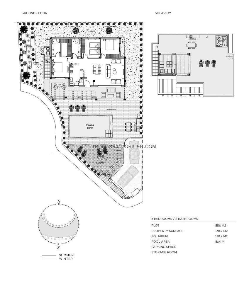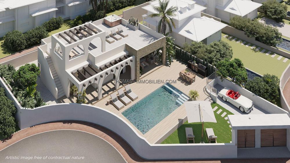 Villa bauen über 1 Stockwerk, mit 3 Schlafzimmern und 2 Bädern, offene Küche mit dem Wohnbereich, Einbauschränke, private Sonnenterrasse, privater Garten mit dem Pool und Parkplatz.