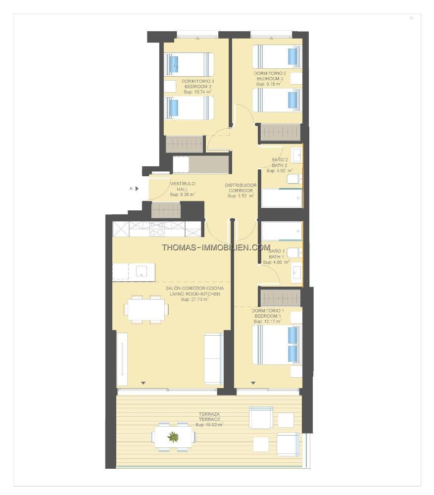 WOHNUNG IN EINER LUXURIÖSEN WOHNANLAGE AM MEER Stellen Sie sich einen Ort vor, an dem das Meer und die Natur zu den Protagonisten einer unglaublichen Geschichte werden: Ihrer. Stellen Sie sich eine Umgebung vor, in der Sie Ihrer Fantasie freien Lauf lassen und tausend Abenteuer zu Lande und zu Wasser erleben können. Willkommen in dieser neuen Residenz in Campoamor, dem Haus, in dem Sie das Leben leben können, von dem Sie immer geträumt haben, mit dem schönsten Horizont im Hintergrund: dem Mittelmeer. Eine 3-Schlafzimmer-Wohnung mit einer großen Terrasse, einer mit modernen Geräten ausgestatteten Küche, den exklusivsten Details und Gemeinschaftsbereichen, die für die ganze Familie gedacht sind. In dieser Wohnanlage zu leben bedeutet, das Mittelmeer in jedem Raum des Hauses zu spüren. Die Wohnanlage befindet sich im höchstgelegenen Teil von Campoamor, ganz in der Nähe des Strandes La Glea und des Yachthafens. Ein zeitgenössisches und modernes architektonisches Design, das exklusive Wohnungen mit hochwertigen Ausstattungen bietet, die Geräumigkeit und neue Technologien in Bezug auf Effizienz und Konstruktion miteinander verbinden. Die imposante Fassade, die Ausgewogenheit ihrer Formen, der Garten im Inneren und die riesige Terrasse der Wohnungen machen diese Wohnanlage zu einer schönen architektonischen Referenz im Mittelmeerraum. Sie werden Grünflächen zum Spazierengehen und Sonnenbaden genießen können. Zu den Gemeinschaftsbereichen gehören ein großer beheizter Innenpool, ein Chill-out-Bereich auf der Dachterrasse, ein Sportbereich für Bewegung im Freien, ein Fitnessraum, ein Kinderspielplatz und ein großer Außenpool sowie ein kleinerer Pool für Kinder und ein Gourmet-Raum. Und weil wir wissen, dass Sie gerne mit dem Fahrrad in der Gegend unterwegs sind, haben wir einen Raum für die Unterbringung von Fahrrädern vorgesehen. Die Bewohner kommen in den Genuss einer erstklassigen Wohnanlage, die für Menschen mit eingeschränkter Mobilität vollständig zugänglich ist und die Garantie bietet, in einem von privaten Sicherheitsdiensten geschützten Bereich zu wohnen. Nur 1000 m vom Strand und eine kurze Fahrt von Einkaufszentren, berühmten Golfplätzen, Restaurants mit exquisiter Gastronomie und Großstädten wie Alicante und Murcia entfernt. Und das alles in einem Klima mit 300 Sonnentagen im Jahr und einer durchschnittlichen Jahrestemperatur von fast 20ºC. Der perfekte Ort für Ihren Urlaub oder für Ihren ständigen Wohnsitz. *