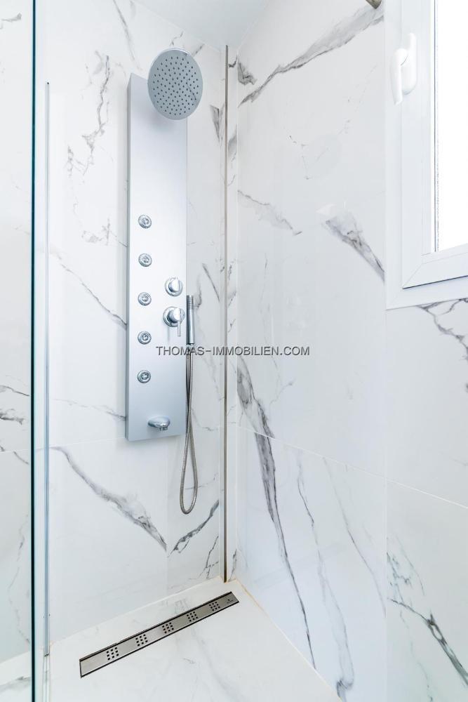 Voll ausgestattete Bäder mit Oberschränken, Spiegel und Duschwand.