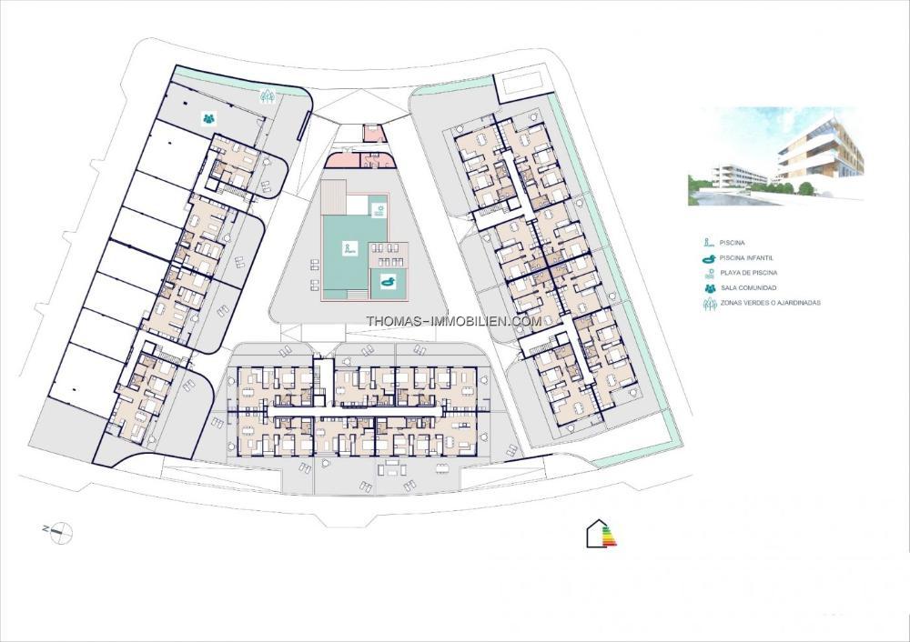 Die Ein- und Ausfahrtstüren der Garage sind automatisch, mit Quetschschutz und Fernsteuerung. Wenn Sie ein Elektroauto besitzen, müssen Sie nach der Schlüsselübergabe keine lästigen Arbeiten in der Garage durchführen, da diese über eine Auflademöglichkeit für diesen Fahrzeugtyp verfügt.. Die Abstellräume sind mit einer Metalltür versehen, die den für den Standort geltenden Vorschriften entspricht. Die Wohnanlage verfügt über Pools für Kinder und Erwachsene, die von einer Sonnenterrasse umgeben sind. Ein Social Club ermöglicht es Ihnen, alle gemeinsamen Einrichtungen zu genießen, wo Sie Partys, Tagungen oder Familiengeburtstage feiern können.