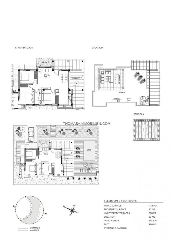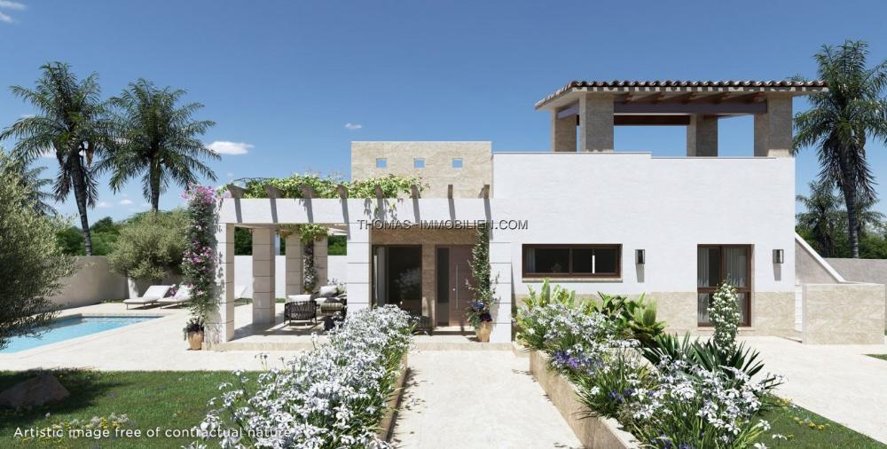 Villa verfügt über Wohn-Esszimmer mit offener Küche, 3 Schlafzimmer und 2 Bäder, große Sonnenterrasse, privater Garten, Schwimmbad und Parkplatz.
