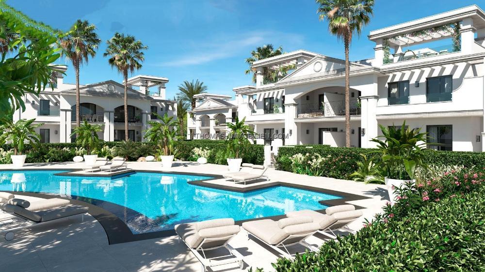 Neubau Wohnanlage von Bungalow-Wohnungen auf 2 Etagen: Erdgeschoss mit privatem Garten und ersten Stock mit privater Dachterrasse.
