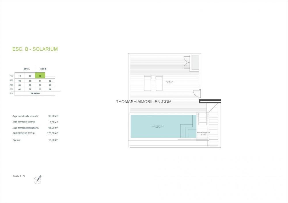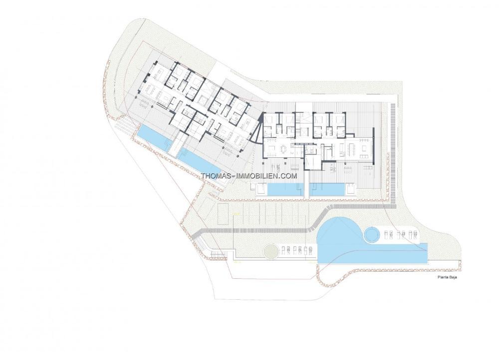 Von den Wohnungen haben Sie direkten Zugang zu großen Terrassen auf der gleichen Ebene wie die Wohnung. Sie haben außerdem eine Treppe, die Sie auf die Sonnenterrasse führt, wo jede Wohnung im obersten Stockwerk einen privaten Swimmingpool, eine Toilette, eine Außenküche mit einem kleinen Aufzug von der Küche im Erdgeschoss und vieles mehr hat.