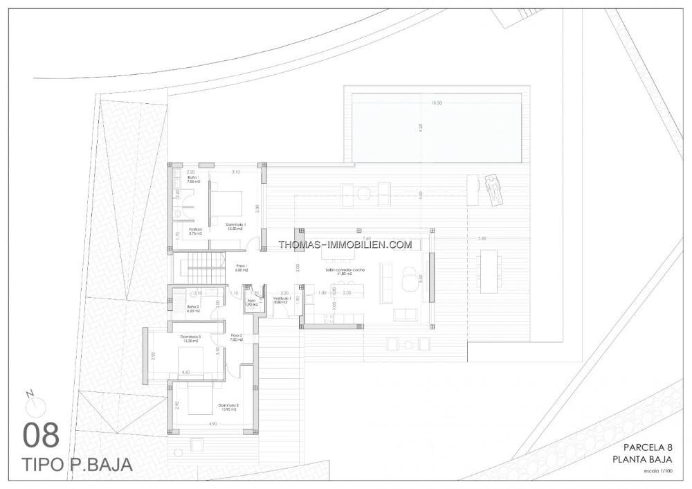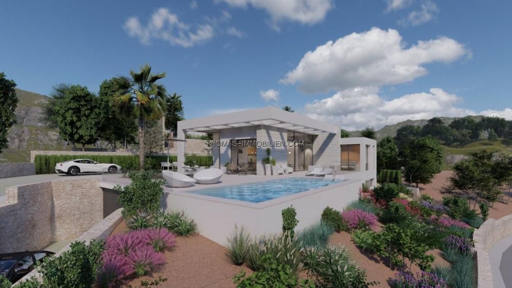 Villa mit 3 Schlafzimmern, 3 Bädern, offenem Wohn-/Essbereich mit Küche, Terrasse, privatem Pool und Garage.