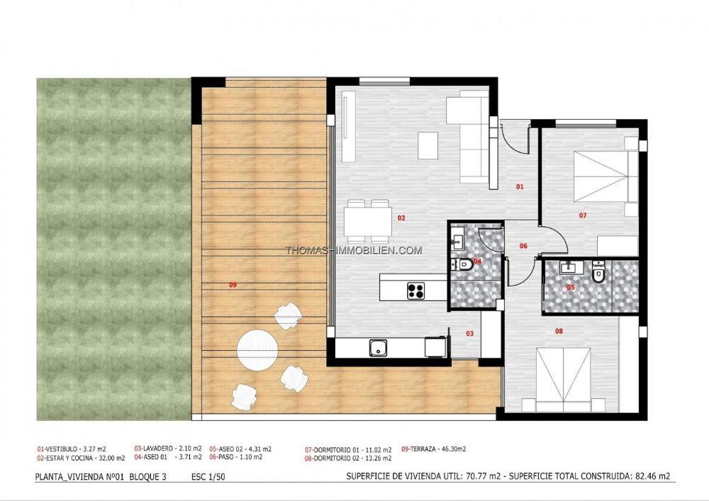 Diese Wohnungen haben einen offenen Grundriss zwischen dem Wohnzimmer und der Küche, 2 oder 3 Schlafzimmer und 2 Bäder.