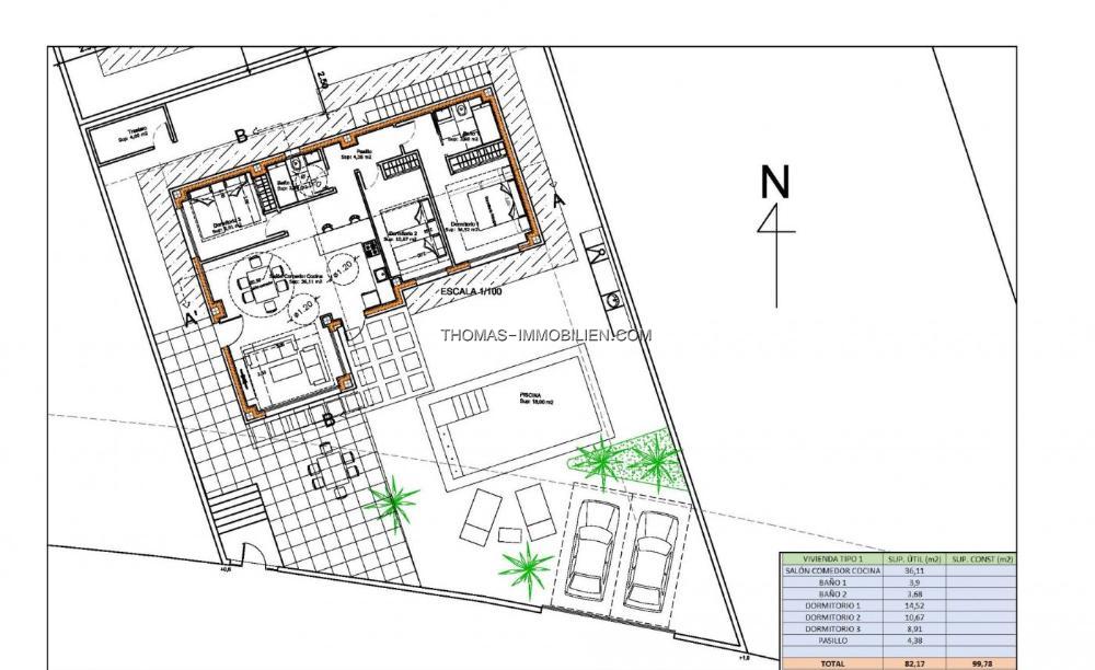 Mit 400 m2 Grundstück und 100 m2 Fläche verteilt sich die Villa auf ein Wohnzimmer - voll ausgestattete Küche, 3 Doppelschlafzimmer und 2 Bäder, beide mit Fußbodenheizung. Die Vorinstallation der Klimaanlage und die besten Oberflächen auf dem Markt sorgen dafür, dass Sie in einer wahrhaft mediterranen Umgebung alle Annehmlichkeiten genießen, die Sie verdienen.