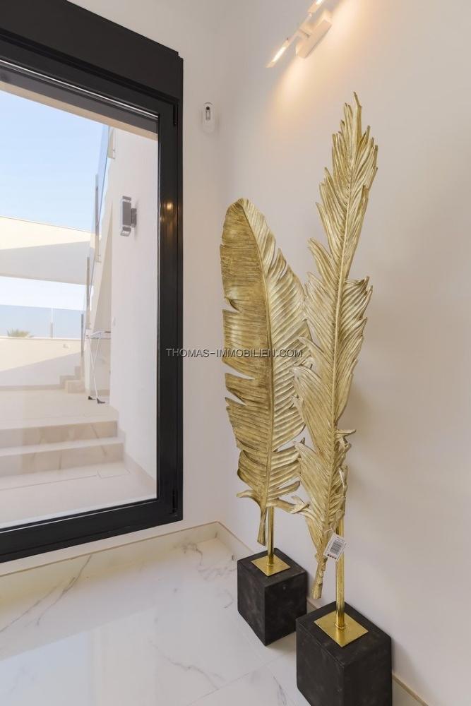 Im ersten Stock gibt es ein Hauptschlafzimmer mit eigenem Bad und ein weiteres Doppelschlafzimmer mit eigenem Bad. Es gibt auch eine große Terrasse, von der aus man über eine Außentreppe auf die private Sonnenterrasse gelangt, auf der eine Vorinstallation für einen Whirlpool mit herrlichem Blick auf die Lagune und ganz Torrevieja vorhanden ist.