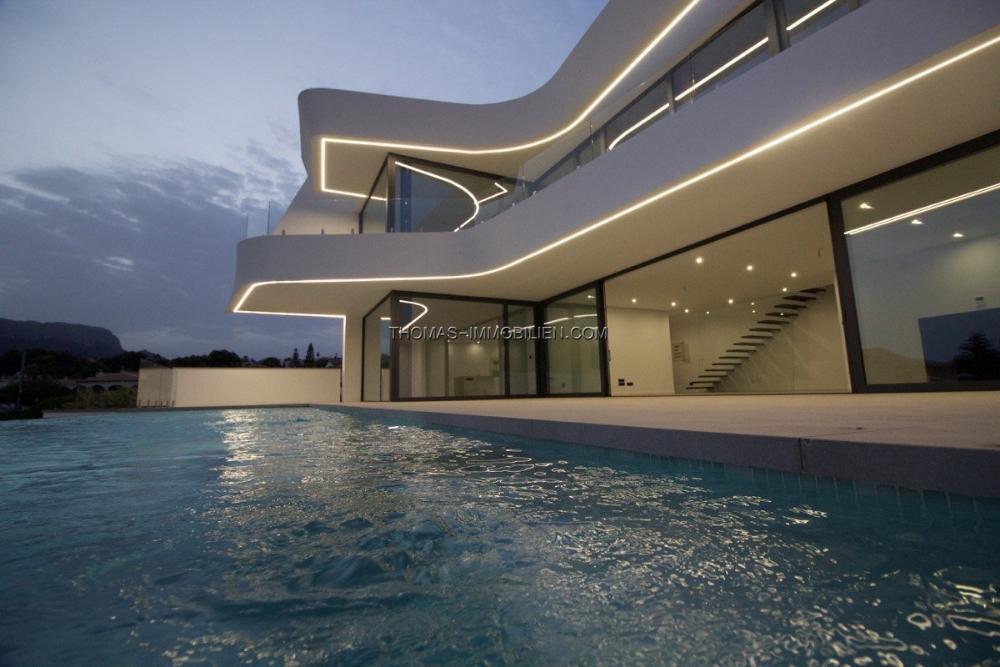SCHLÜSSEL BEREIT. Villa Leonidas, einzigartiger moderner Baustil mit innovativen und avantgardistischen Linien, entworfen vom bekannten Architekten Ramón Gandía Brull, in der Urbanisation Enginent in der Nähe von Restaurants und nur wenige Gehminuten von Strand, Supermärkten usw. entfernt, moderner Neubau Villa zu verkaufen in Calpe an der Costa Blanca von Alicante, moderne Villa mit privatem Infinity-Pool (10,5 x4), Grill und Garten, gebaut auf einem 922m2 großen Grundstück, 303 m2 auf zwei Etagen gebaut, die durch eine Innentreppe verbunden sind, 4 Schlafzimmer mit Bad Badezimmer, 1 WC, Wohnzimmer mit offener amerikanischer Küche mit BOSCH-Geräten (Kühlschrank, Waschmaschine, Geschirrspüler, Backofen, Herd, Dunstabzugshaube und Mikrowelle).