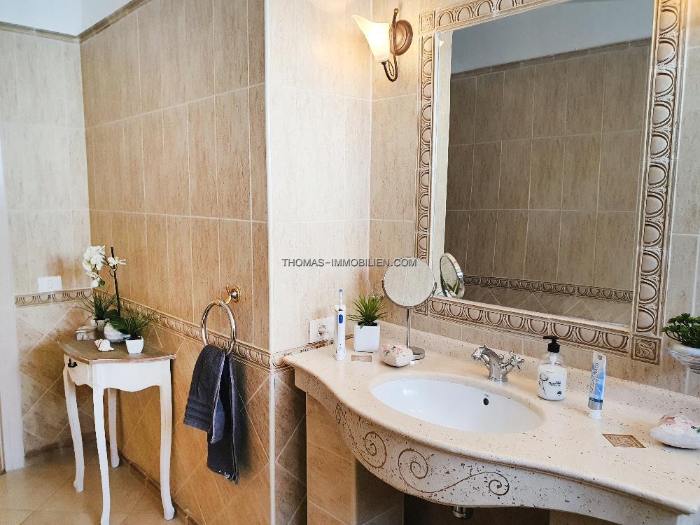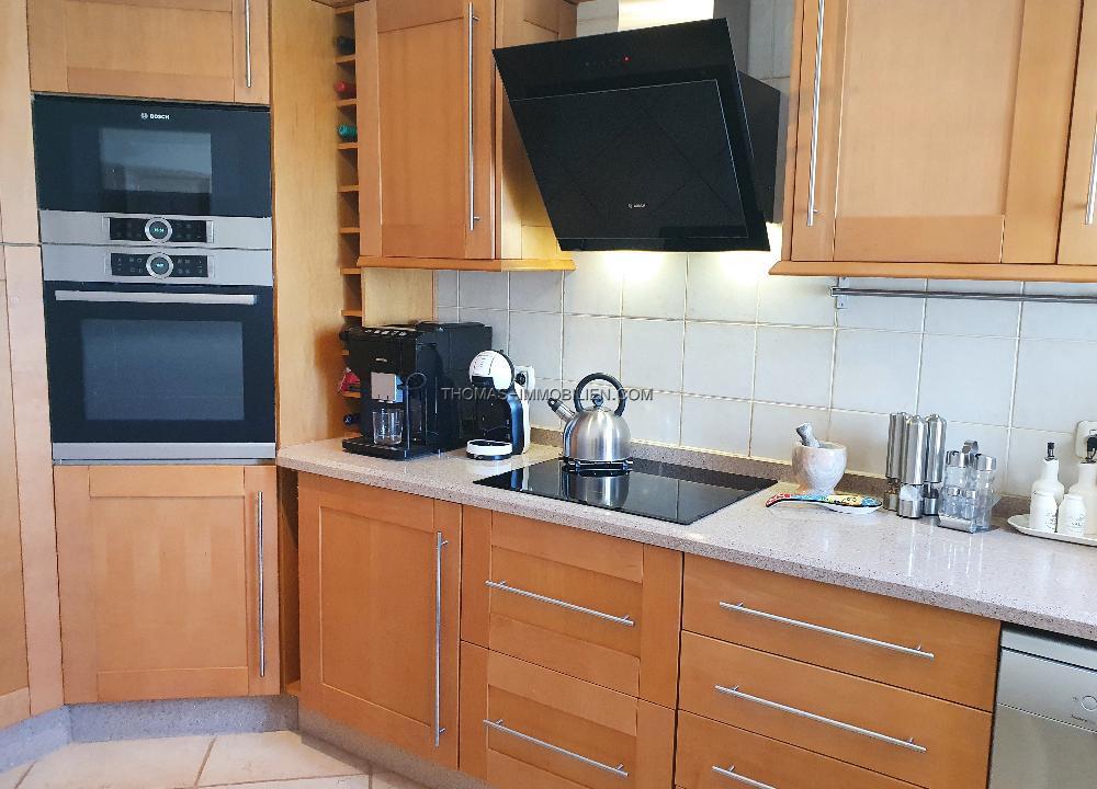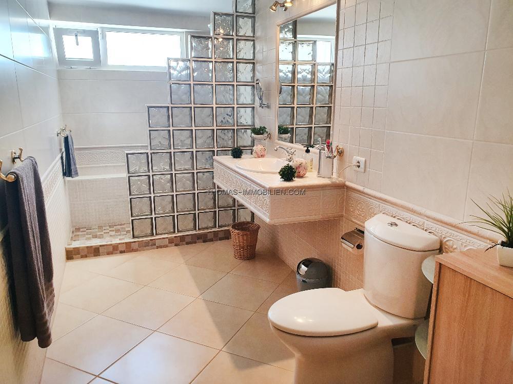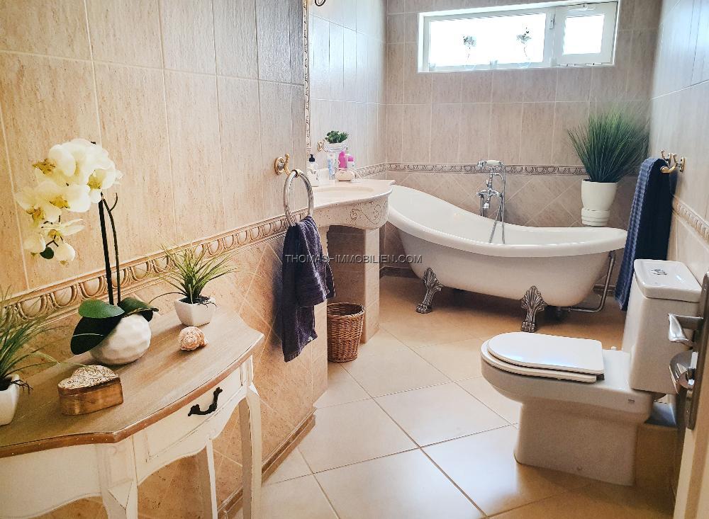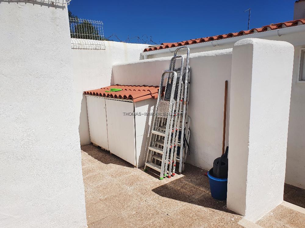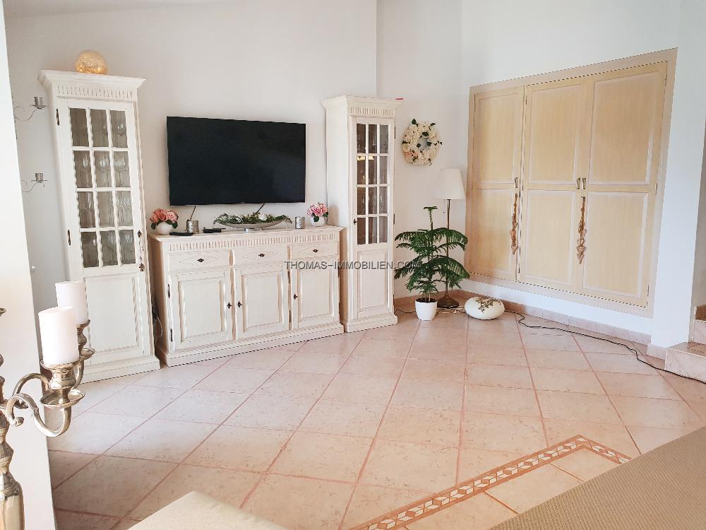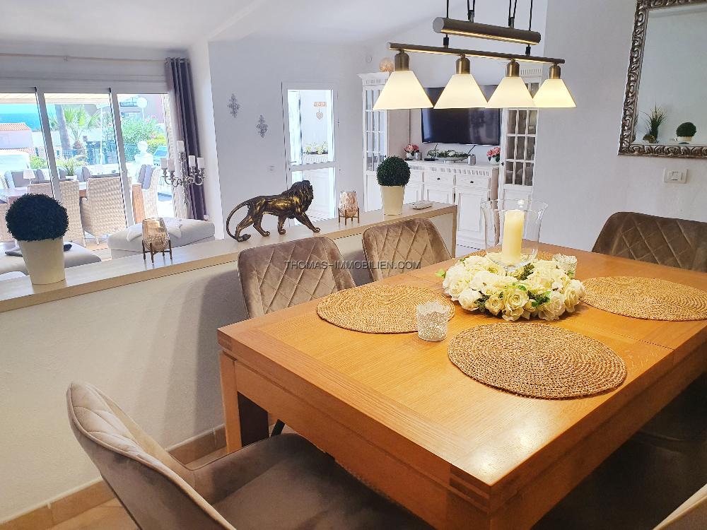 Das Erdgeschoss der Villa erstreckt sich über zwei Ebenen und besteht aus einer separaten, voll ausgestatteten Küche, einem Essbereich, einem Wohnzimmer mit Zugang zur Außenterrasse und zum privaten Garten, drei Doppelschlafzimmern, zwei Bädern und einem Hauswirtschaftsraum. Im Obergeschoss befindet sich ein Schlafzimmer mit eigenem Bad, das derzeit als Arbeitszimmer genutzt wird. Das Haus wurde komplett renoviert und wird möbliert verkauft. Es ist klimatisiert, hat Moskitonetze und Satellitenfernsehen. Auf der Rückseite des Anwesens befindet sich ein kleiner privater Innenhof mit weiterem Lagerraum.