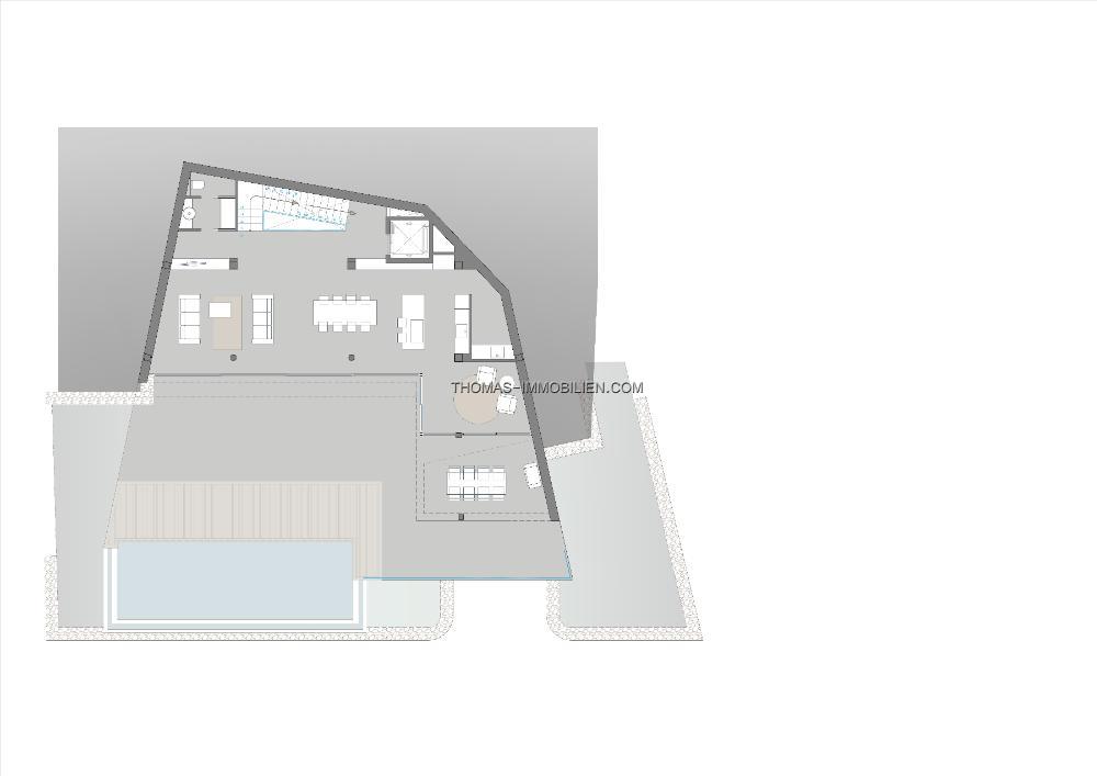 Im Erdgeschoss befindet sich ein offener und heller Wohnbereich, der sich perfekt für den täglichen Gebrauch und die Bewirtung von Gästen eignet. Hier befindet sich ein großzügiges Wohn-Esszimmer, das mit einer modernen, offenen Küche verbunden ist, die mit einer Koch- und Arbeitsinsel ausgestattet ist. Ein Gäste-WC und ein praktischer Hauswirtschaftsraum vervollständigen diese Etage. Große Schiebetüren führen auf die geräumige Terrasse, die viel Platz für Sonnenliegen, einen Esstisch und eine Sitzecke bietet und an einen herrlichen 31 m² großen Swimmingpool grenzt, der zum Entspannen und Vergnügen einlädt.