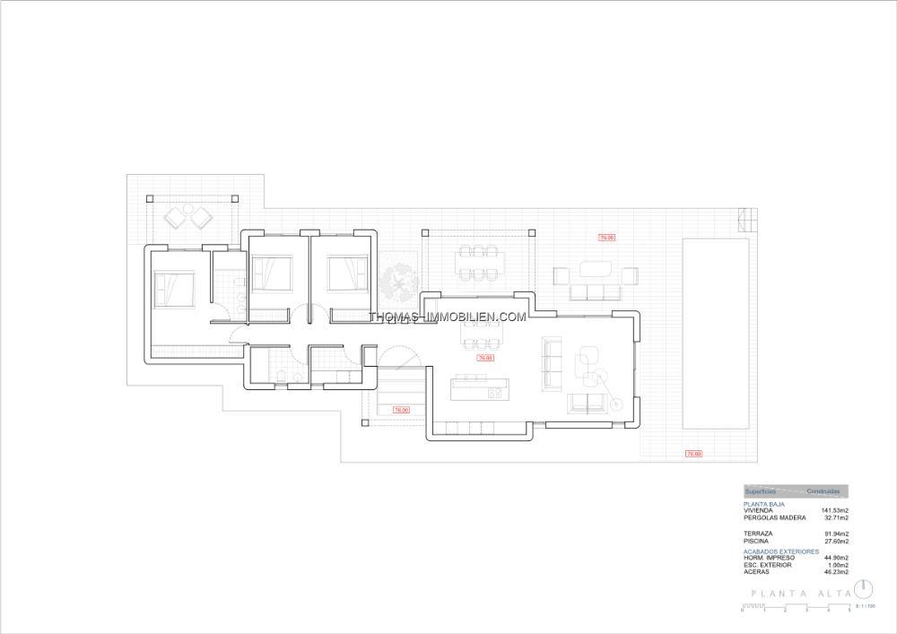 Darüber hinaus gibt es einen separaten Wasch-/Abstellraum.Alle Räume bieten direkten Zugang zur Außenterrasse mit Swimmingpool, wodurch Innen- und Außenbereich nahtlos ineinander übergehen. Der Garten ist pflegeleicht und bietet viel Privatsphäre. Das Grundstück ist umzäunt und verfügt über ein motorisiertes Eingangstor für Fahrzeuge.Zusätzlichen Komfort bieten eine eingebaute Klimaanlage (Kanalsystem), Doppelverglasung, eine Außendusche am Pool und eine praktische Aufteilung auf einer Ebene – ideal für diejenigen, die Komfort suchen, ohne auf Stil verzichten zu müssen.Diese Villen sind eine ausgezeichnete Wahl für alle, die eine Zweitwohnung, einen Altersruhesitz oder eine Investition an der Küste der Costa Blanca Nord suchen.Merkmale im Überblick:Villen im Ibiza-Stil in grüner Umgebung3 Schlafzimmer, 2 BadezimmerOffene Küche mit Kochinsel (Bosch-Geräte)Privater Pool und TerrassePflegeleichter GartenKlimaanlage, Doppelverglasung, elektrisches Eingangstor10 Minuten von Calpe, Moraira und Benissa entfernt1 km vom Strand von La Fustera entferntSind Sie auf der Suche nach einer komfortablen, ebenerdigen Neubauvilla in Benissa? Dann kontaktieren Sie uns für weitere Informationen oder eine Besichtigung.