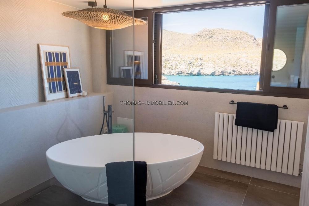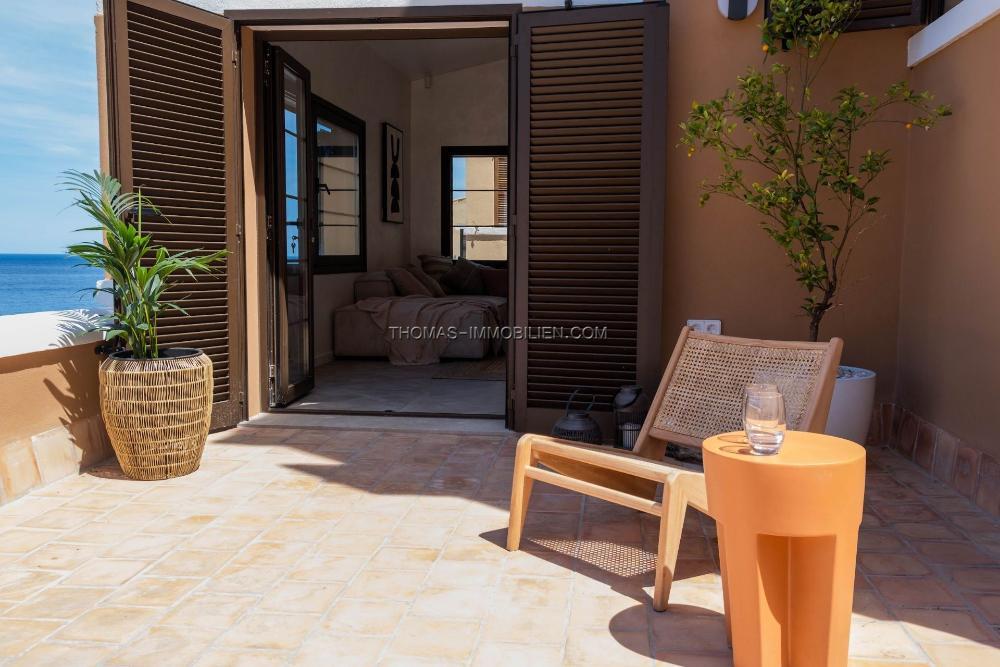Der erste Stock umfasst zwei geräumige Schlafzimmer. Das Hauptschlafzimmer, das über ein eigenes Badezimmer und eine private Terrasse verfügt, bietet eine ruhige Umgebung. Das zweite Schlafzimmer ist hell und bietet Ausblicke auf das klare Wasser von Cala Carbó.