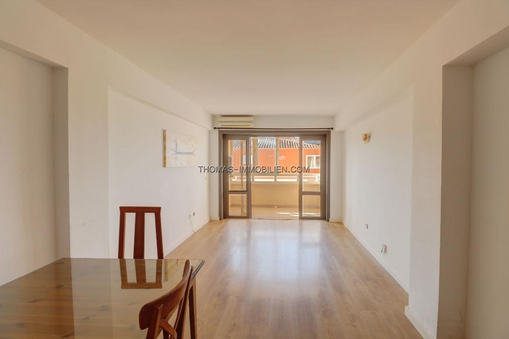 Die Wohnung verfügt über zwei Schlafzimmer und ein Badezimmer. Eines der Schlafzimmer hat einen privaten Balkon mit seitlichem Blick auf Port Adriano, der sich perfekt für den morgendlichen Kaffee eignet. Der Hauptwohnbereich ist ein einladender, offener Raum, der Wohnzimmer und Essbereich in einem fließenden Design kombiniert, das das natürliche Licht maximiert. Die Küche ist voll funktionsfähig und verfügt über eine praktische Frühstücksbar und einen großen Hauswirtschaftsraum, der die Praktikabilität erhöht.