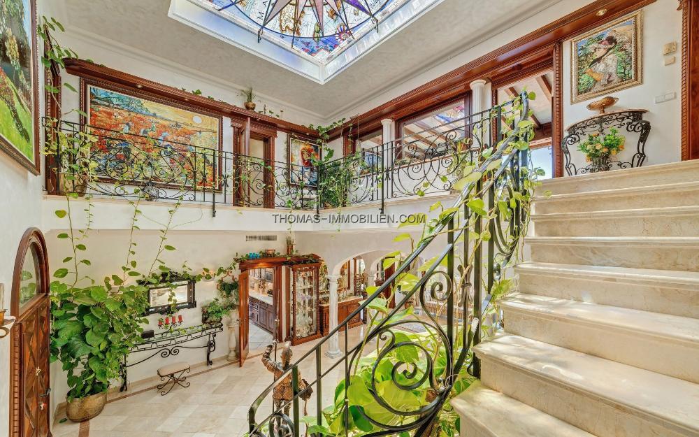 Von den imposanten, handgeschmiedeten Eisentoren führt eine Auffahrt entlang eines wunderschönen Gartens zu einer breiten Treppe und dem Hauptwohnbereich. Zusätzlich führt ein eleganter Aufzug von der Garage in beide Ebenen des Hauptgebäudes. Eine schwere Eingangstür aus antikem Nussbaumholz öffnet sich zur ca. 10 m hohen, hellen Eingangshalle mit Buntglaskuppel, die eine alte Karte der Balearen darstellt.