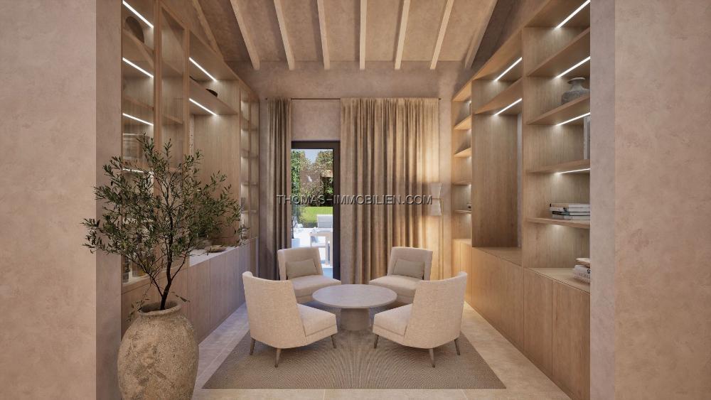 Die maßgeschneiderte Küche ist mit hochwertigen Geräten ausgestattet und für Unterhaltung konzipiert, sie öffnet sich direkt zu 285 m² Terrassen und dem 10-Meter-Infinity-Pool. Die Hauptess- und Wohnbereiche genießen hohe gewölbte Decken mit freiliegendem Mauerwerk, während eine zweite gemütliche Lounge mit einem doppelseitigen Kamin einen intimen Rückzugsort bietet.
