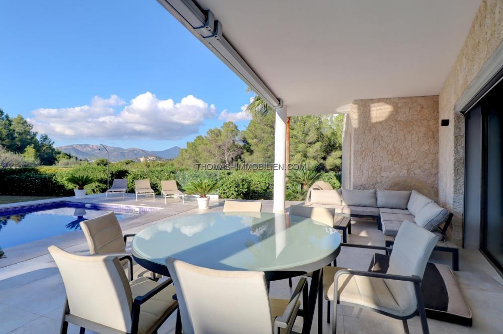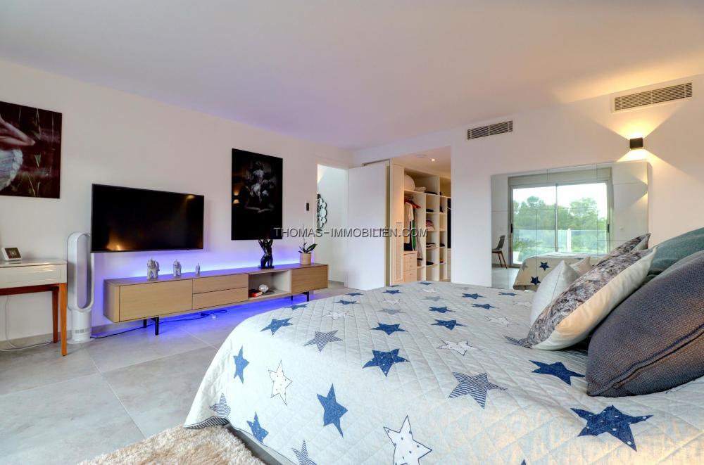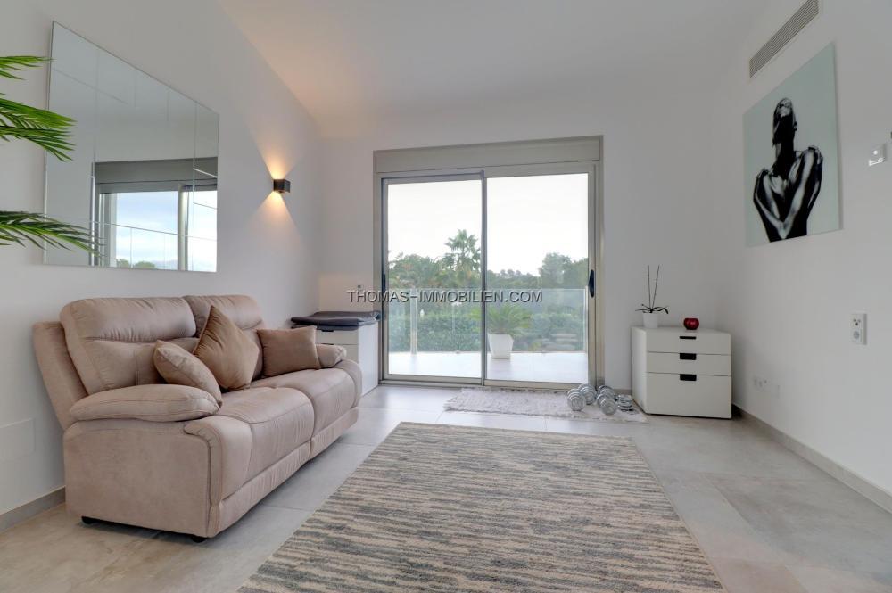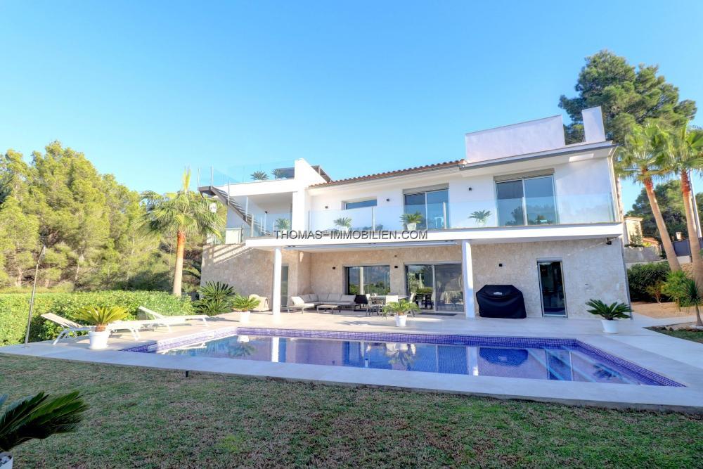 Komplett renovierte, moderne Villa mit Meerblick in Nova Santa Ponsa, direkt neben einem Grüngebiet, in ruhiger Lage und in der Nähe mehrerer Golfplätze, Tennisclubs, Strände, des luxuriösen Port Adriano und des kleinen Yachthafens von Santa Ponsa. Hochwertige Materialien und Ausstattung – Klimaanlage, elektrische Jalousien, Alarmanlage, Videokameras (alles bequem per App über Ihr Smartphone steuerbar).