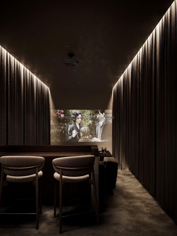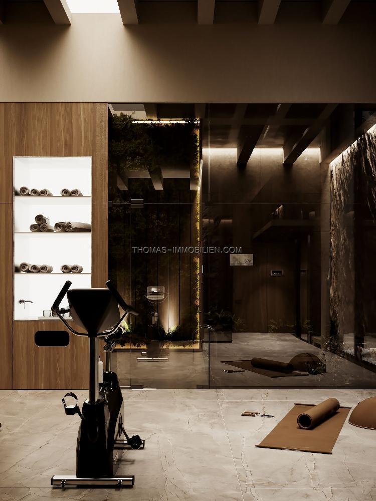 Die untere Ebene des Anwesens umfasst ein modernes Fitnessstudio, ein privates Hallenbad, ein Spa, einen Massagebereich, eine Sauna, einen Kinoraum und einen Weinkeller. Ein Waschraum und Abstellraum sind ebenfalls auf dieser Ebene vorhanden.