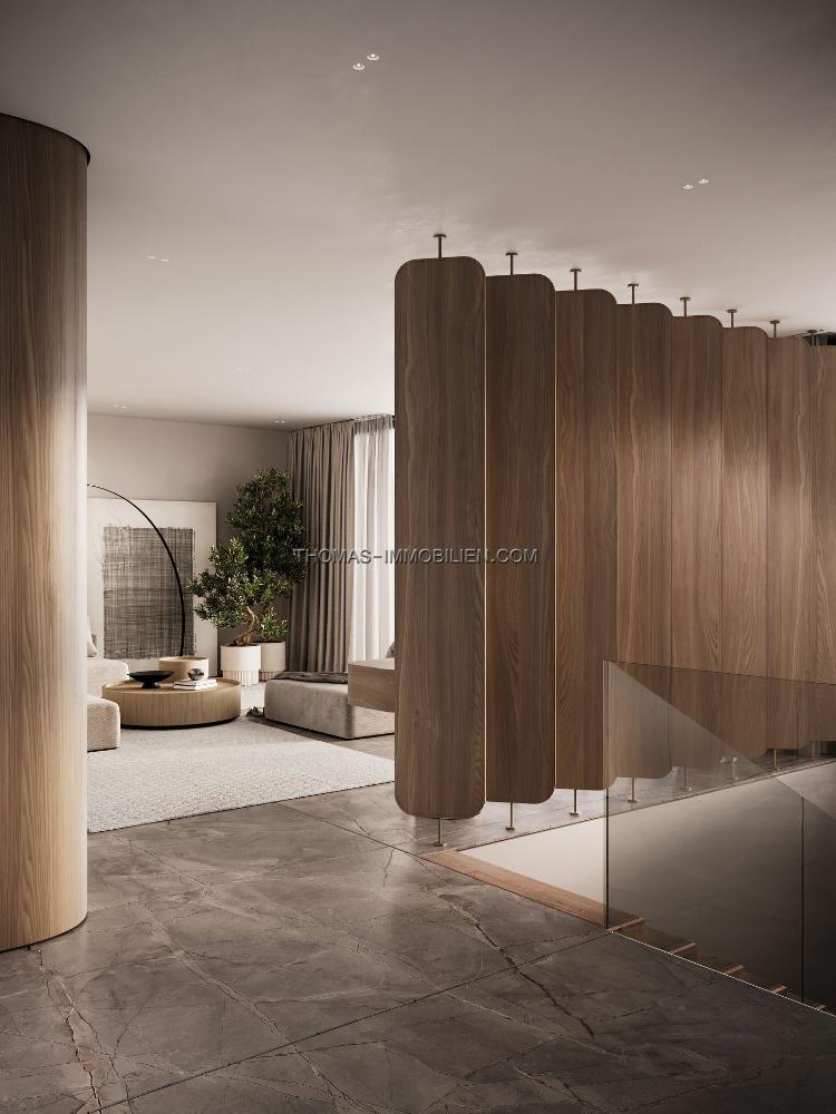 Beim Betreten öffnen sich große Glastüren zu den Terrassen, und das Layout integriert die Wohn-, Ess- und Küchenbereiche. Die Küche ist mit Geräten ausgestattet. Ein Naturstein-Kamin befindet sich im Wohnzimmer.