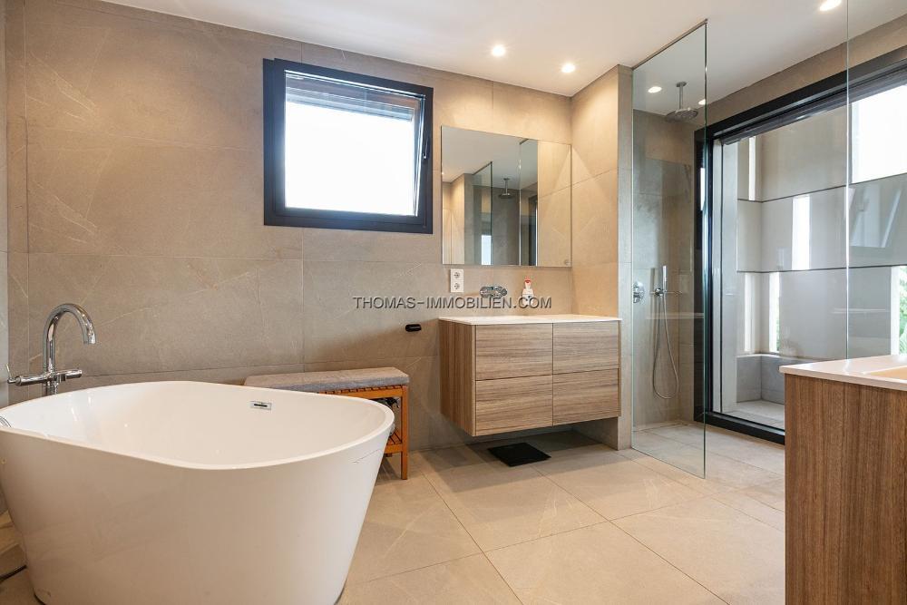 Auf ca. 630 m² bebauter Fläche bietet diese Villa 7 geräumige Doppelzimmer und 6 Badezimmer, verteilt auf drei Ebenen und durch einen Aufzug für vollständigen Komfort verbunden.