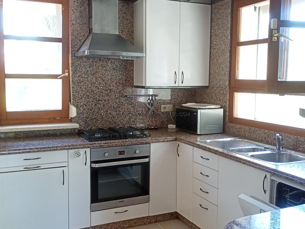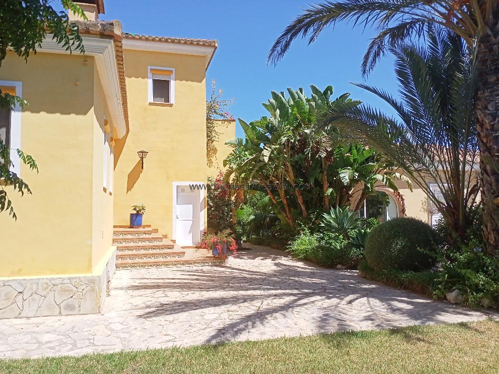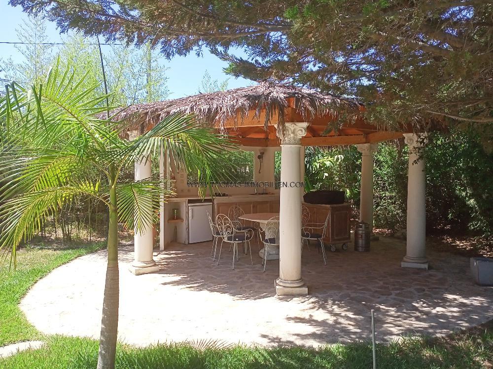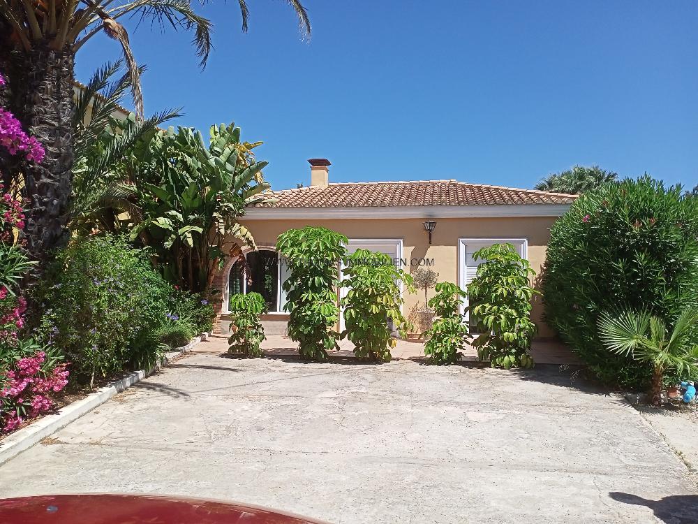 Fantastisches Anwesen zum Verkauf zwischen Denia und Ondara, in sehr ruhiger Lage und Meer nähe. Die Villa mit 150 m² Wohnfläche verteilt sich in eine Eingangshalle mit Einbauschränken, einem großen Wohn-Esszimmer, einem verglasten halbkreisförmigen Raum mit Panoramablick auf das Park ähnlich angelegte Grundstück, eine voll ausgestattete Einbauküche, 3 Doppelschlafzimmer mit Einbauschränken, 2 Bäder und eine Gästetoilette. Die Villa verfügt über Gaszentralheizung, Klimaanlage, Doppelverglasung, Jalousien und Moskitonetze. Durch einen mit Bananen Palmen gesäumten Weg getrennt befindet sich neben der Villa ein weiteres Gebäude von 50 m2 mit offener Küche, komplettem Bad, einem Schlafzimmer mit großen Schränken und einer sehr schönen überdachten Terrasse. Das mit viel Liebe angelegte Parkähnliche Grundstück von 5000 m² verzaubert mit verschiedenen mediterranen Pflanzenarten, Palmen, Zitrus Bäumen, Sträuchern, und Blumen, mehreren Terrassen, einem Pavillon mit Sommerküche und einem 12m x 5m großen Pool im Zentrum. Es gibt einen Carport für 1 Auto und Außenparkplatz für 5 Autos. Das gesamte Grundstück ist eingezäunt und durch ein Metalltor mit Gegensprechanlage ausgestattet.