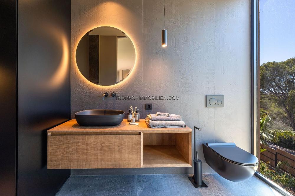 Die Villa verfügt über fünf luxuriöse Schlafzimmer, jedes mit eigenem Bad, was Komfort und Privatsphäre für alle Bewohner und Gäste bietet. Die Hauptsuite ist ein Ort der Ruhe, mit einer eigenen Terrasse und einem Spa-ähnlichen Badezimmer mit hochwertigen Armaturen. Mit insgesamt fünf Vollbädern und einem Gäste-WC ist diese Villa auf Bequemlichkeit und Eleganz ausgelegt. Jedes Badezimmer ist mit hochwertigen Ausstattungen ausgestattet, darunter Marmorarbeitsplatten und Designerarmaturen.