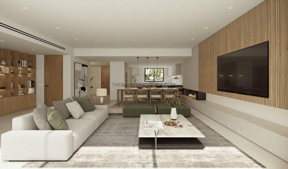 Die zweistöckige Villa verfügt über ein helles, offenes Layout im Erdgeschoss, einschließlich einer stilvollen Eingangshalle, einer modernen Küche mit Frühstücksbar, einem Essbereich mit gemütlichem Kamin, einem Arbeitsbereich, einem Gäste-WC und einem geräumigen Wohnzimmer mit direktem Zugang zur Terrasse.