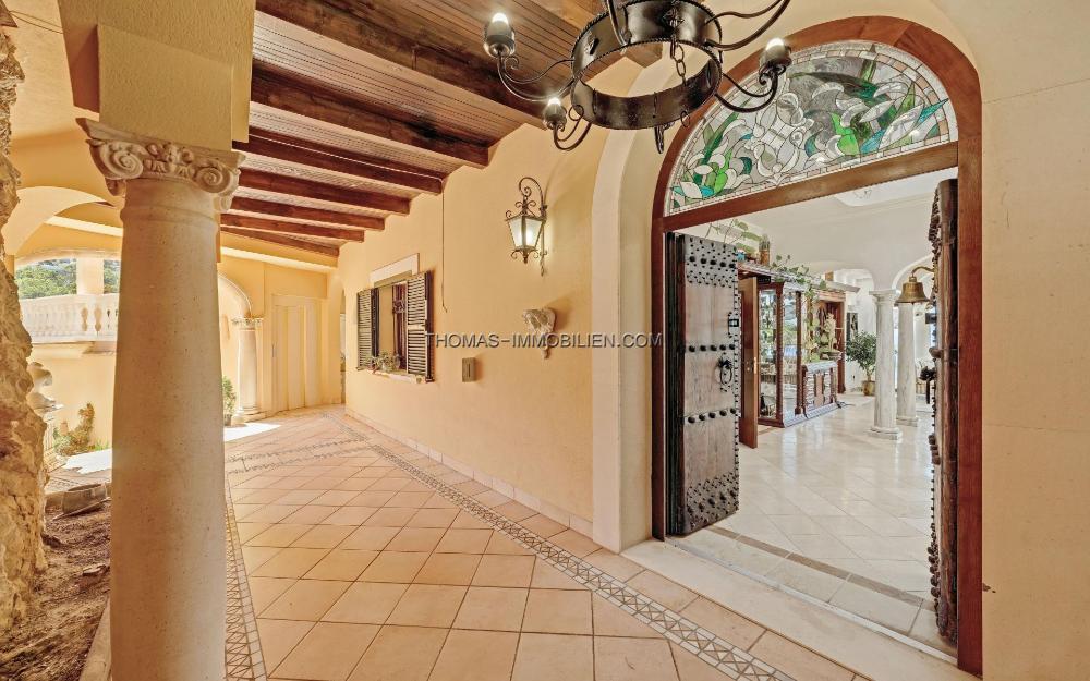 Von den imposanten, handgeschmiedeten Eisentoren führt eine Auffahrt entlang eines wunderschönen Gartens zu einer breiten Treppe und dem Hauptwohnbereich. Zusätzlich führt ein eleganter Aufzug von der Garage in beide Ebenen des Hauptgebäudes. Eine schwere Eingangstür aus antikem Nussbaumholz öffnet sich zur ca. 10 m hohen, hellen Eingangshalle mit Buntglaskuppel, die eine alte Karte der Balearen darstellt.