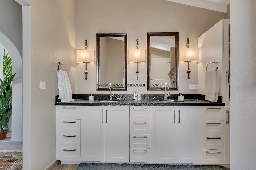 Es gibt auch eine Gästetoilette. Die moderne Küche ist bereits voll ausgestattet mit einem amerikanischen Side-by-Side Kühlschrank und einem weiteren gemütlichen Essbereich. Auf dieser Ebene befindet sich auch das Hauptschlafzimmer mit En-Suite Badezimmer.Über eine Außen Treppe gelangt man in das Obergeschoss, wo sich eine weitere Suite befinden mit einem eigenen angrenzenden Bad. Von diesem Zimmer aus haben Sie direkten Zugang zu einer weiteren absolut privaten Terrasse.Über selbige Außen Treppe gelangt man auf die schöne Pool-Area mit dem großen Swimmingpool 10m x 5m und Außendusche. Auf der Terrasse gibt es genug Platz für mehrere Sonnenliegen und einen überdachten Terrassenplatz, welcher auch sehr einfach zu einem Barbecue umfunktioniert werden könnte. Auf dieser Ebene befindet sich der großzügige Gästebereich mit einem gemütlichen offenen Wohn- Ess – und Küchenbereich, einem großes Eltern- Schlafzimmer, zwei weiteren Schlafzimmern, einem Familienbad, sowie einer Waschküche. So kann die Familie oder die Freunde in dem separaten Apartment mit viel Privatsphäre das sensationelle Klima und die tolle Atmosphäre genießen. Apropos genießen !